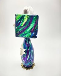 The face is a flowing aurora borealis that dances on all sides with glittery stars and a color changing sheen. An igloo sits atop the blockhead while polar bear miniatures crawl up the face and body. A sleek wood burned midnight blue with aurora greens and purples dancing up the length. With a decorative brass base.