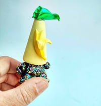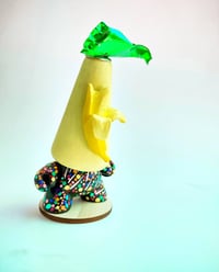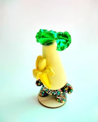 This listing is for one Banana Man figure. This is No.1 in an edition of 8 total created. He features a wooden head with peeled banana charm face. The body is a customized Kidrobot munny. Black vinyl with rainbow speckled dots and flares. His hair is a metallic green bottle cap.