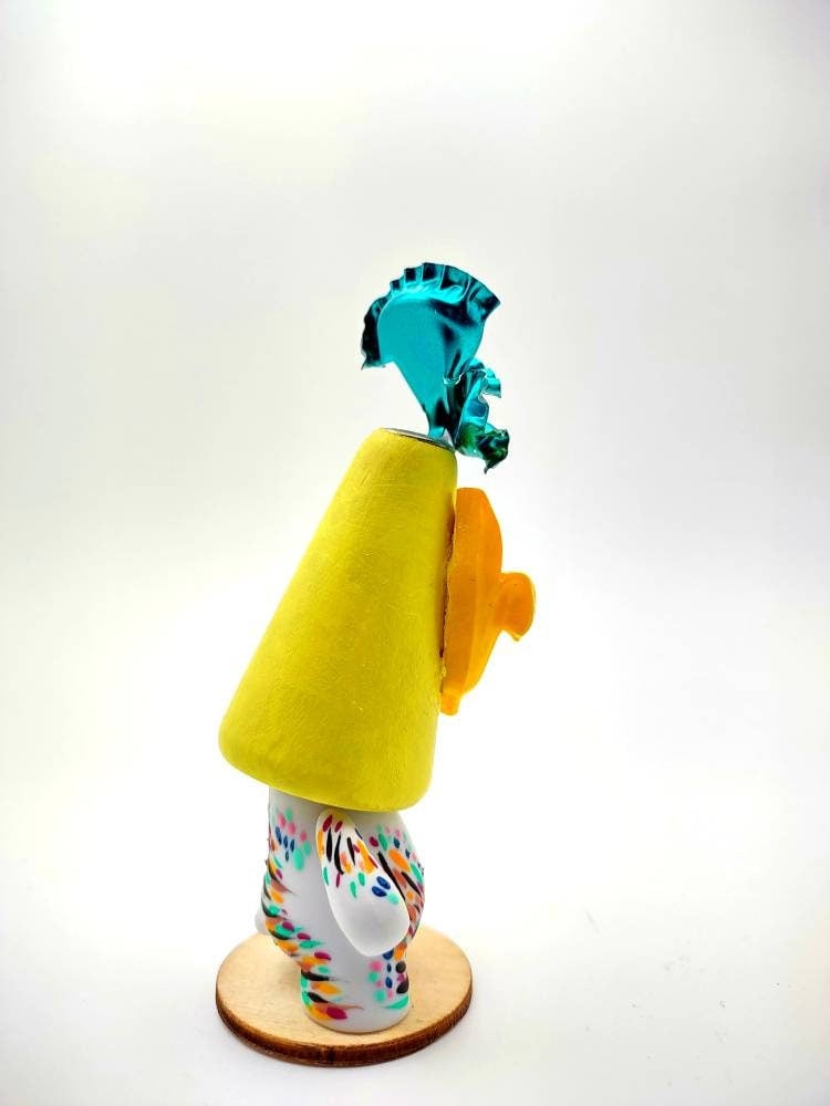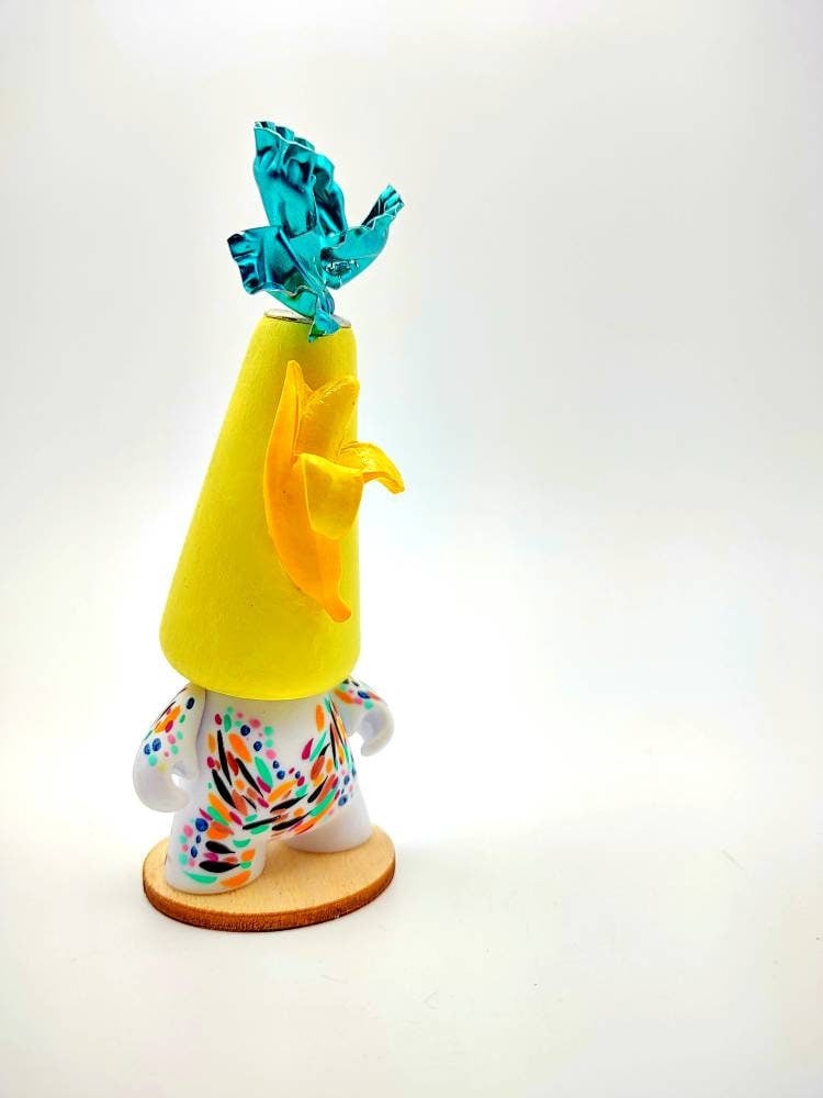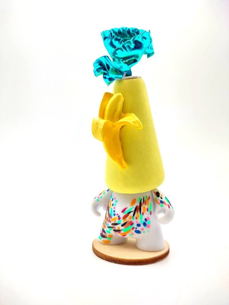 This listing is for one Banana Man figure. This is No.3 in an edition of 8 total created. He features a wooden head with peeled banana charm face. The body is a customized Kidrobot munny. Yellow vinyl with rainbow speckled dots and flares. His hair is a metallic orange bottle cap.