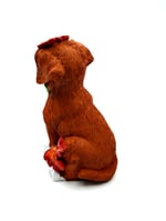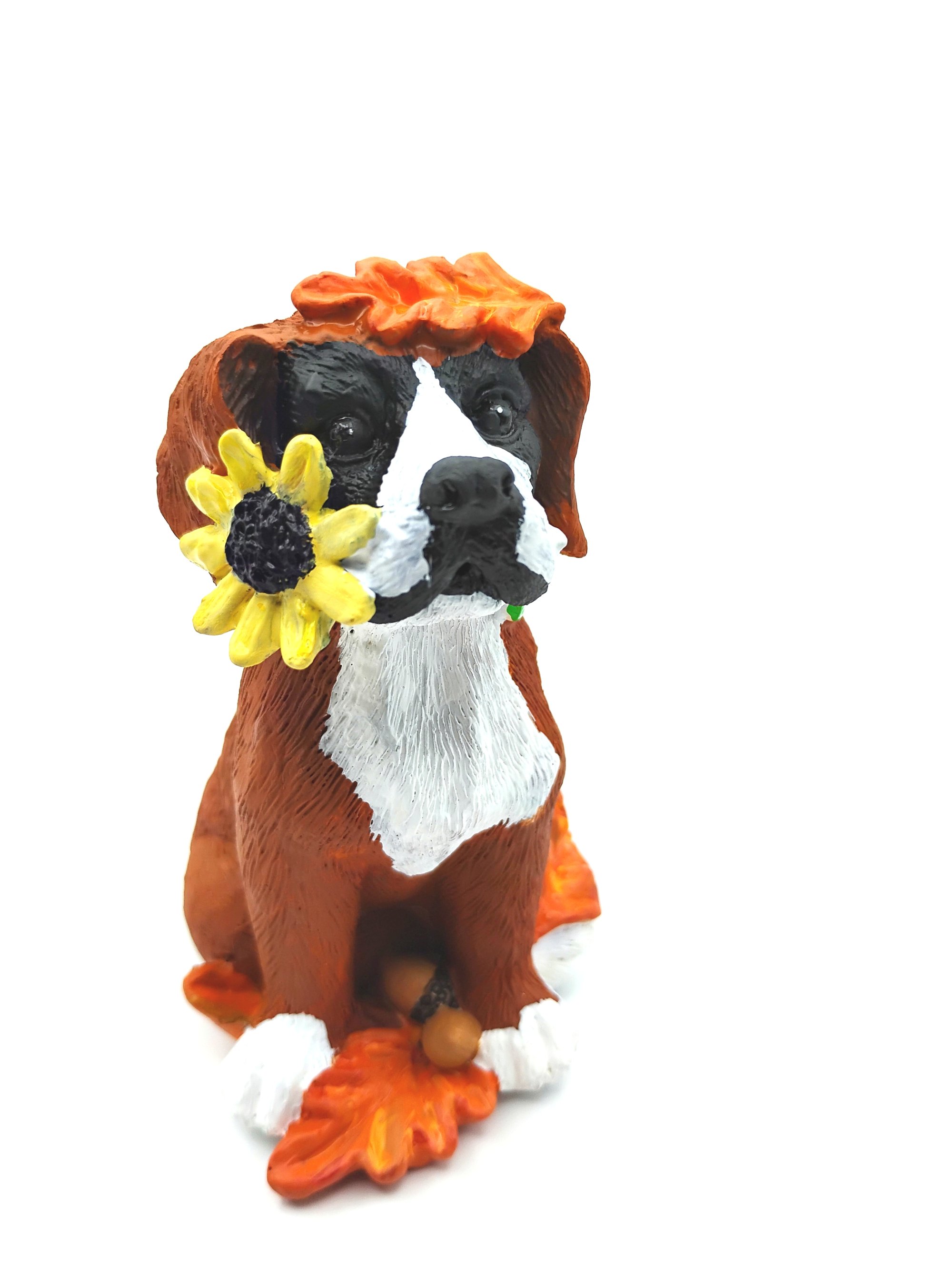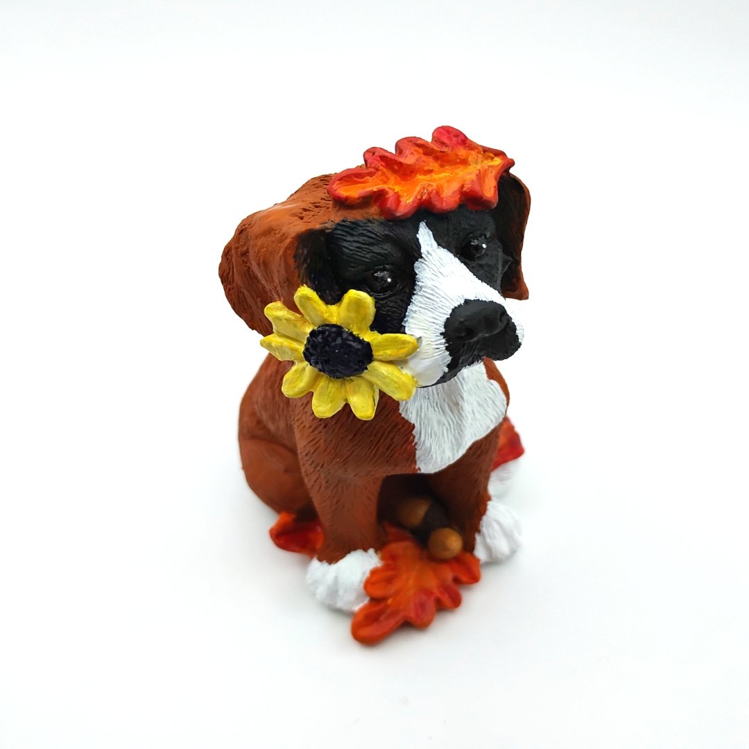 I painted two of these total this season. Resin hand painted boxer puppy sitting with a sunflower in his mouth and autumn leaves around him.