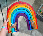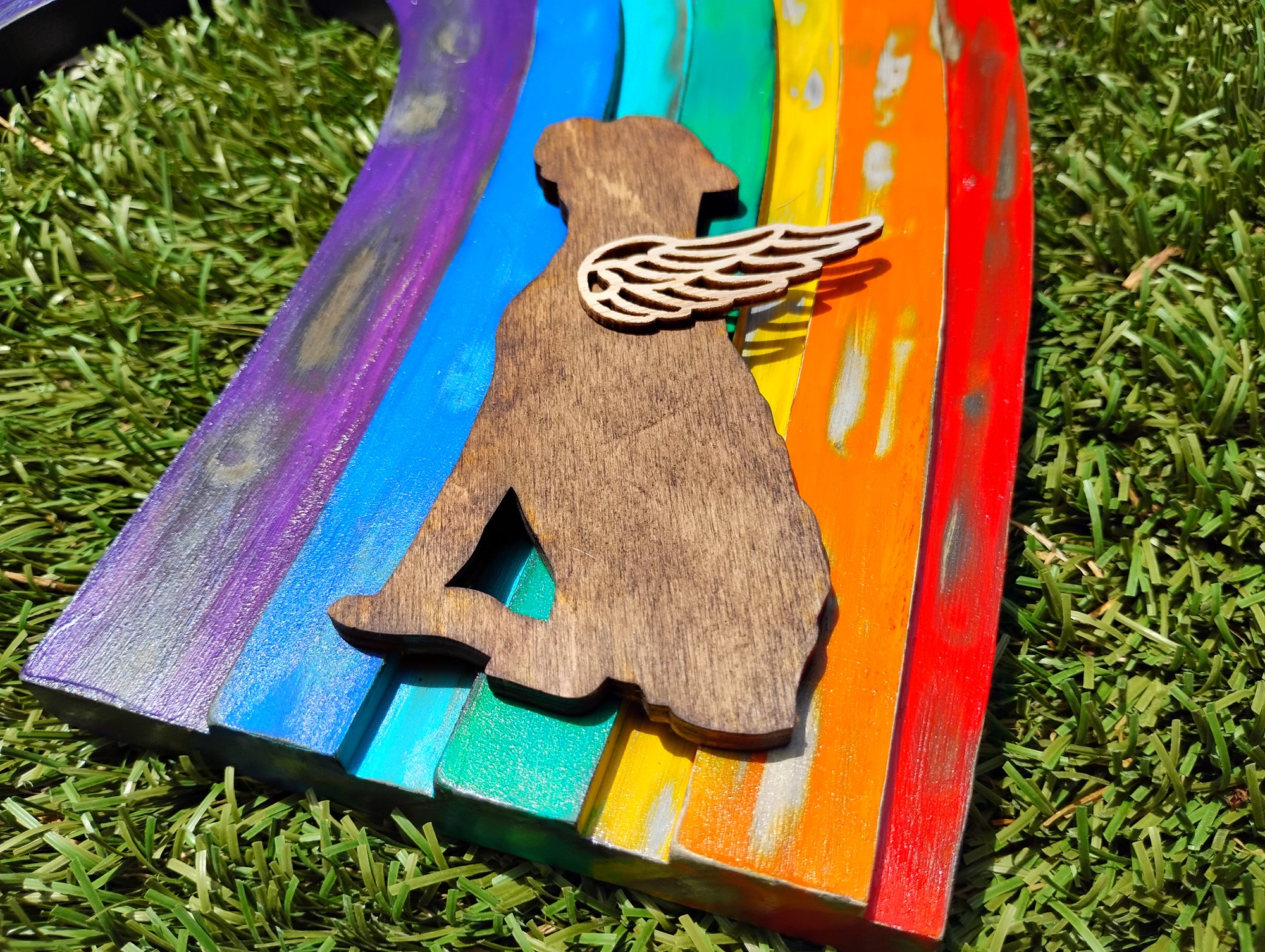 Hand painted wood rainbow that's been flamed to give it a rustic feel. With fawn boxer angels at each end. One standing and one sitting. If you want to customize the angels, message me or put it in the purchase notes (for example two white boxers, or one fawn and one brindle, etc). Comes ready to hang.