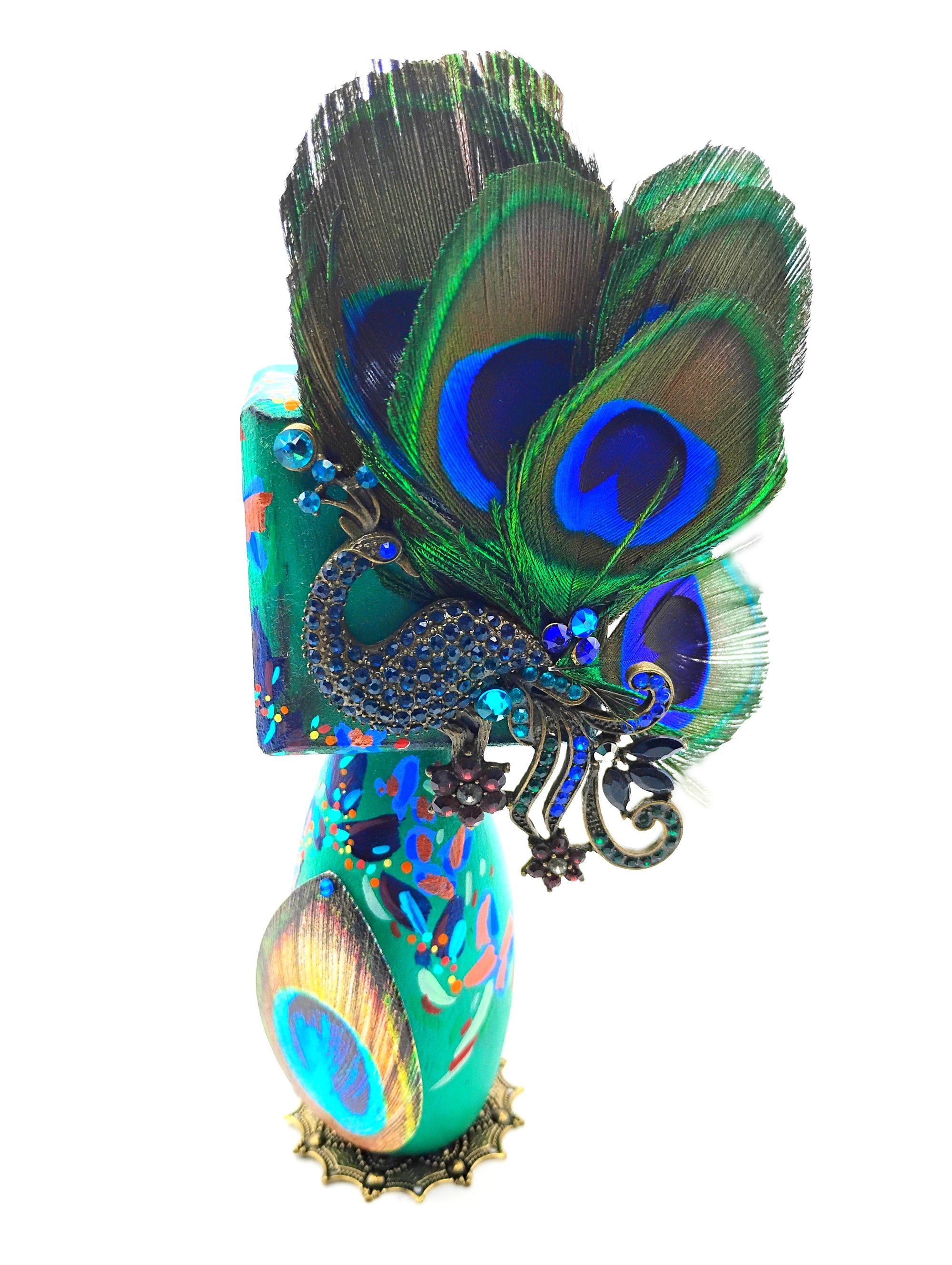 This one of kind wood peacock sculpture is painted a peacock teal. With a vibrant bejeweled peacock brooch and real peacock feathers, and splashes of color around the head and down the trunk.
