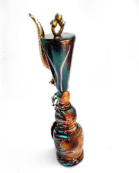 These gorgeous ladies are made of wood with Kokeshi doll styling in mind. Each is burned, stained and hand painted. Featuring a fox brooch on the face and vintage looking ornate jewel pendants as the 'dress'.